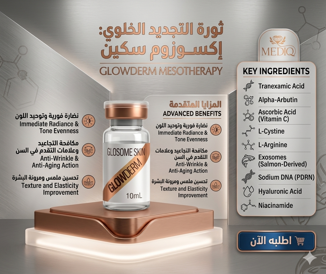 استعيدي حيوية بشرتك مع Exosome Skin Glowderm من mediQ ، التركيبة المتطورة والأكثر فعالية في عالم العلاج بالميزوثيرابي (Mesotherapy). صُمم هذا المنتج خصيصاً ليكون الحل الأمثل لإصلاح البشرة على المستوى الخلوي، مما يمنحك مظهراً شاباً، مشدوداً، وأكثر نضارة من أي وقت مضى.